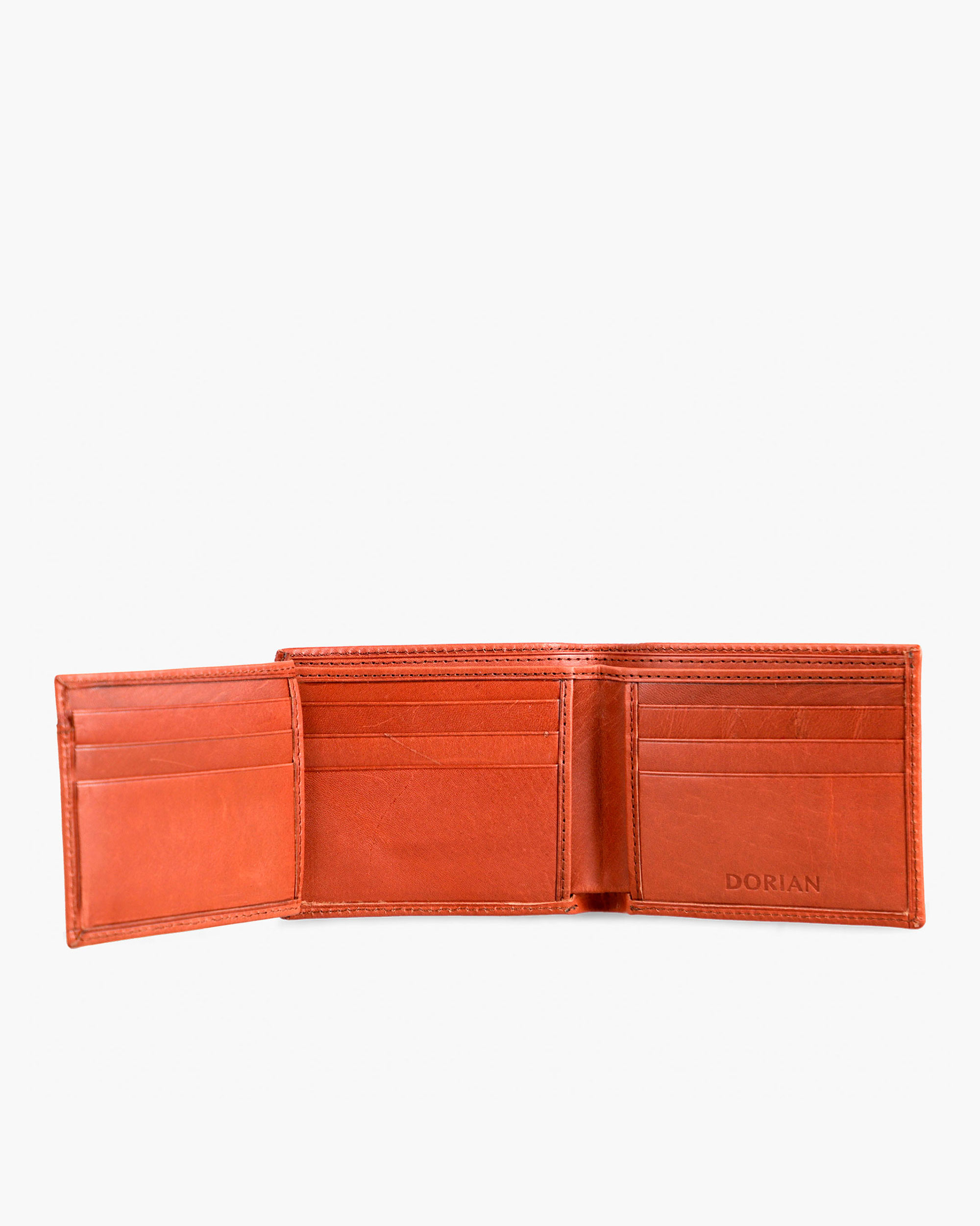 Cuero argentino de calidad con logo metálico DORIAN. Un clásico atemporal. Dos compartimentos para billetes y doce para tarjetas, con volante extra para DNI, registro y cédula.