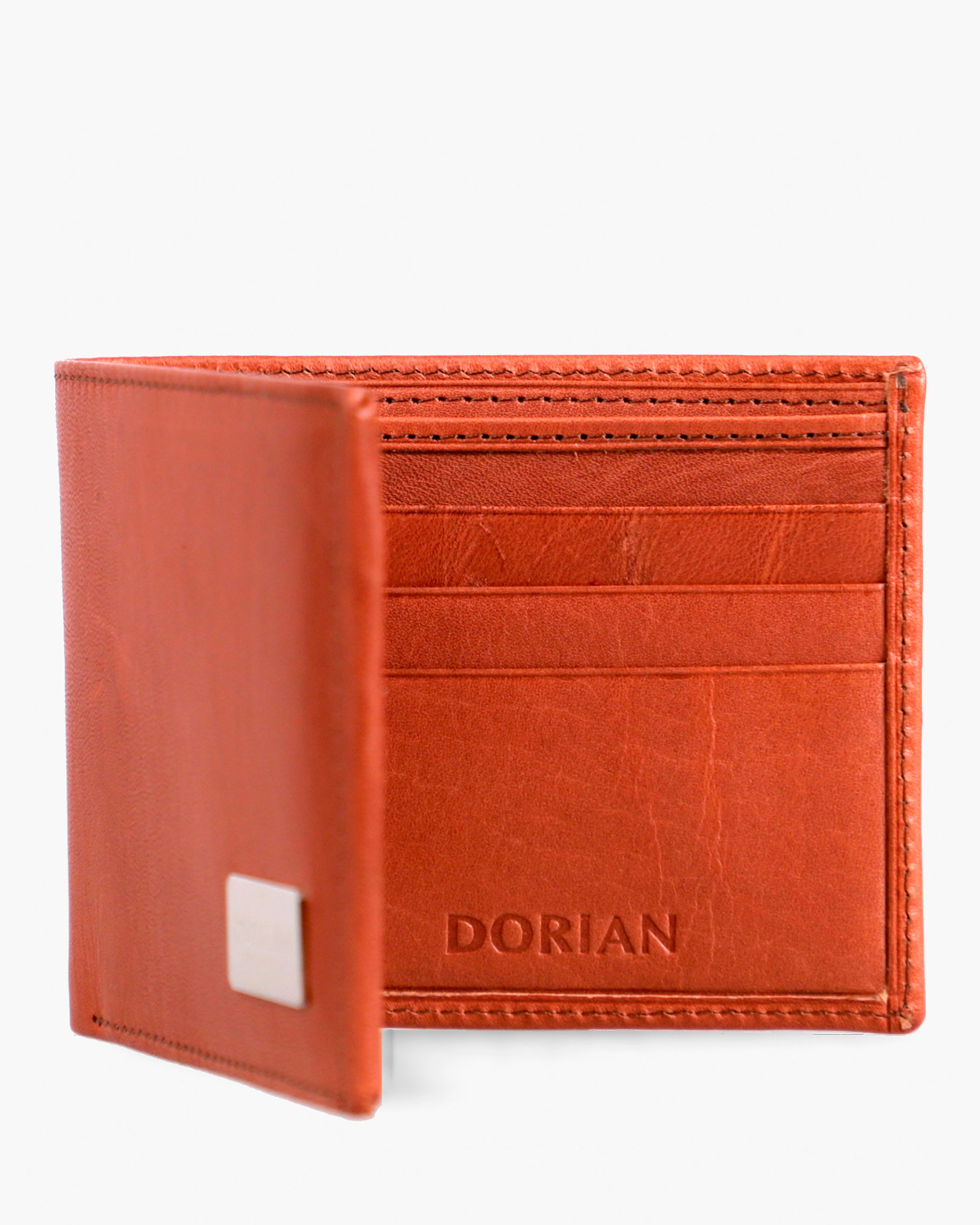 Cuero argentino de calidad con logo metálico DORIAN. Un clásico atemporal. Dos compartimentos para billetes y doce para tarjetas, con volante extra para DNI, registro y cédula.