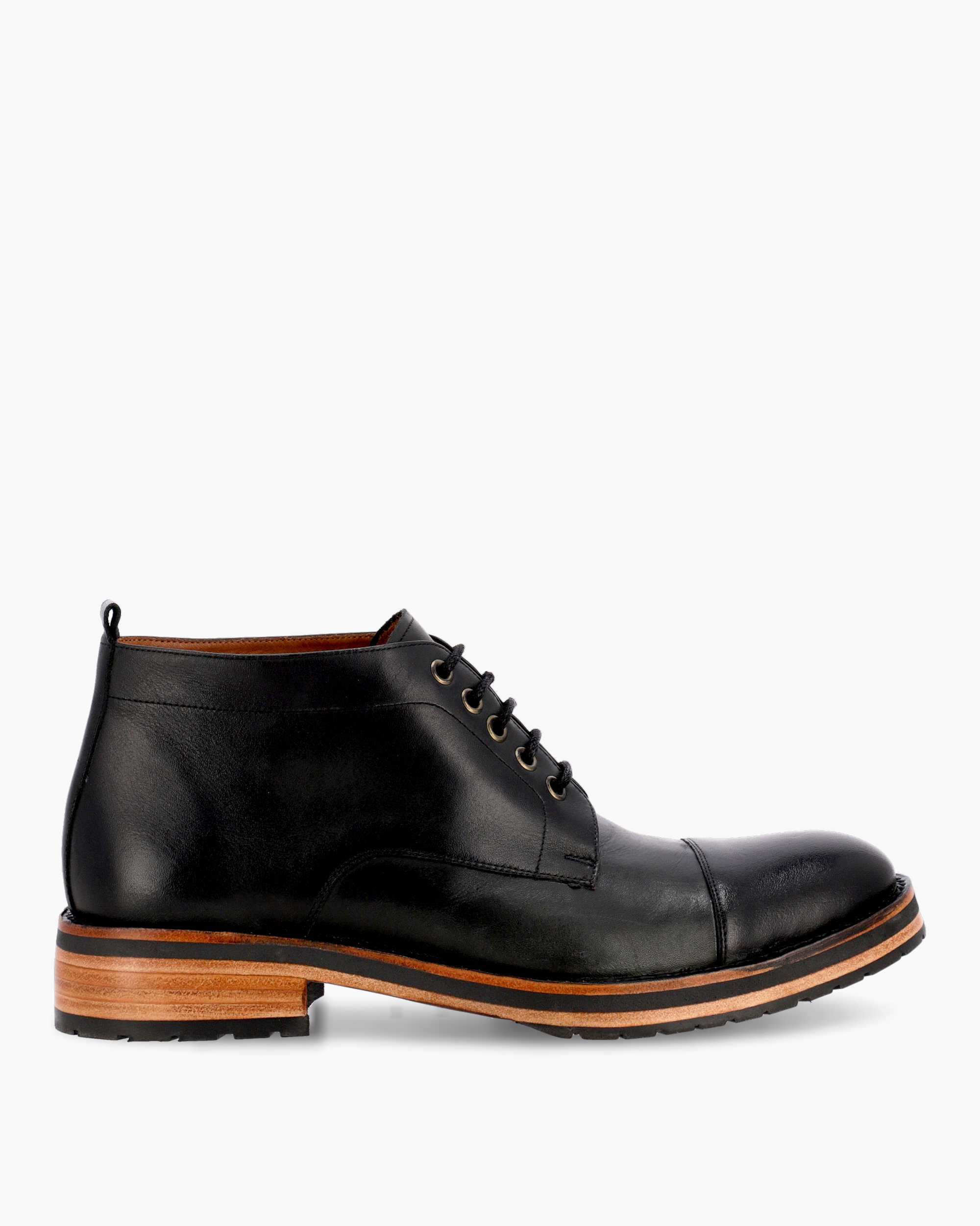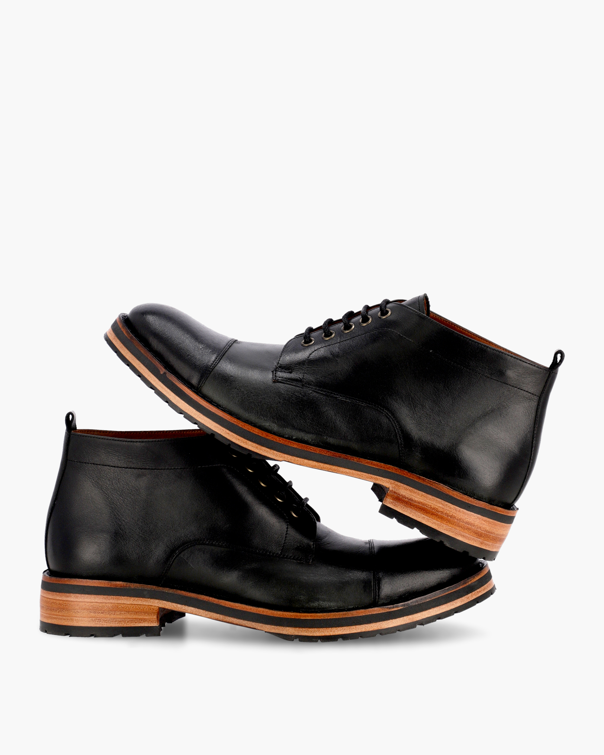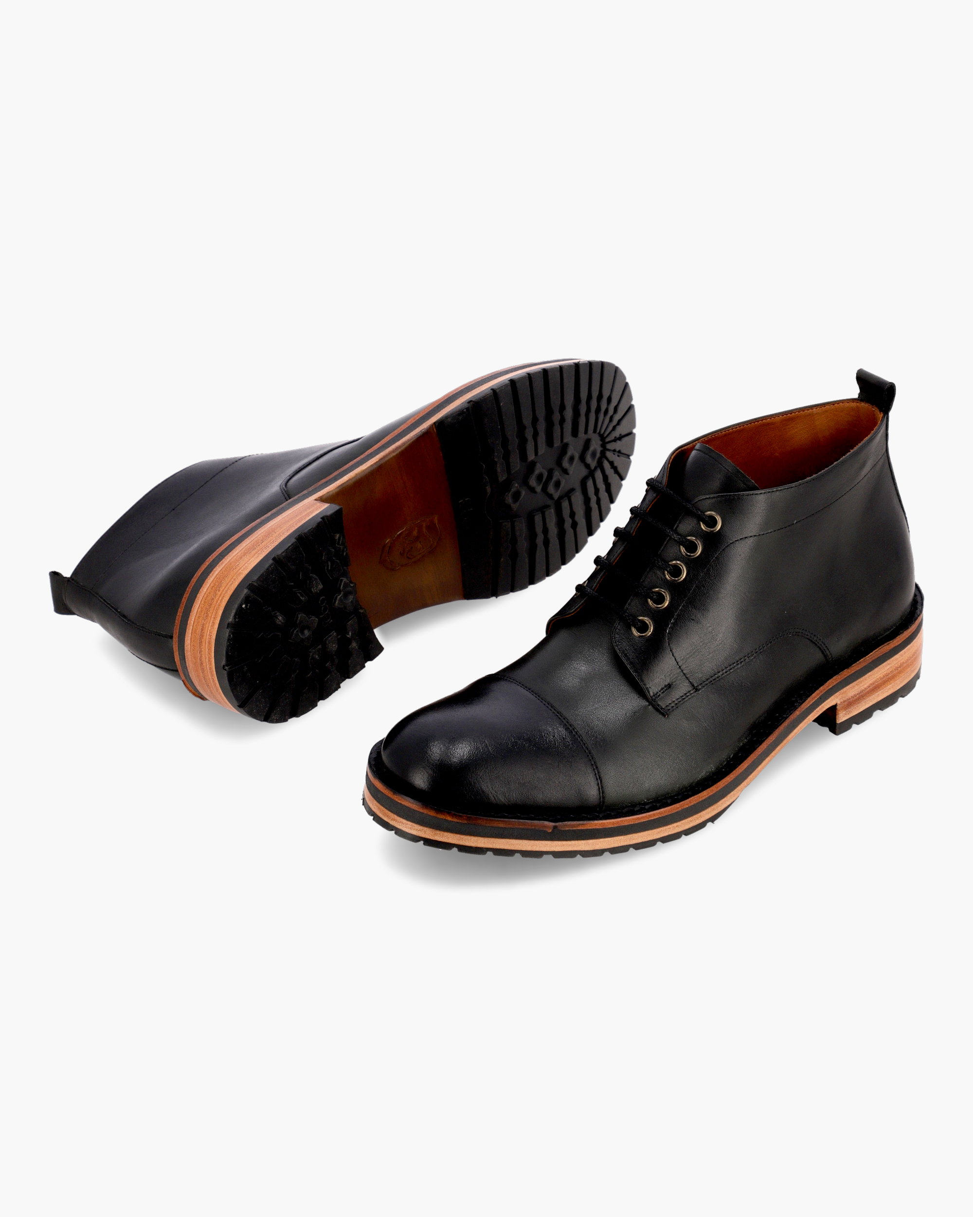 Bota de confección artesanal en cuero legítimo, interior forrado en cuero. Suelín Febo rutero de caucho, con antideslizante en el talón. El taco mide 3,5 cm de altura y los cordones son de algodón encerado.