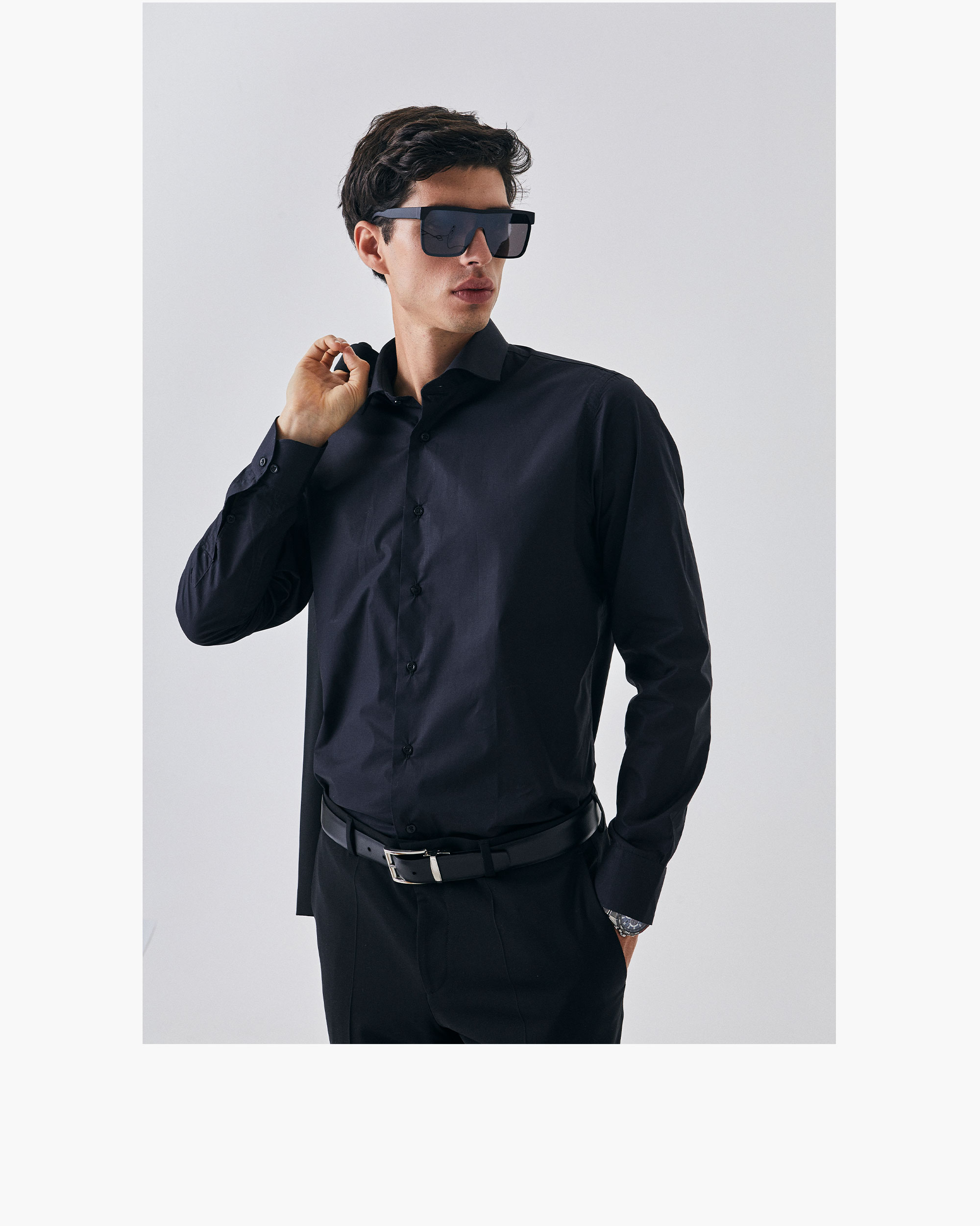 Camisa manga larga lisa confeccionada con algodón de saten, tejido de alta calidad, fesco y suave al tacto. Detalle de brillo sutil, corte slim.