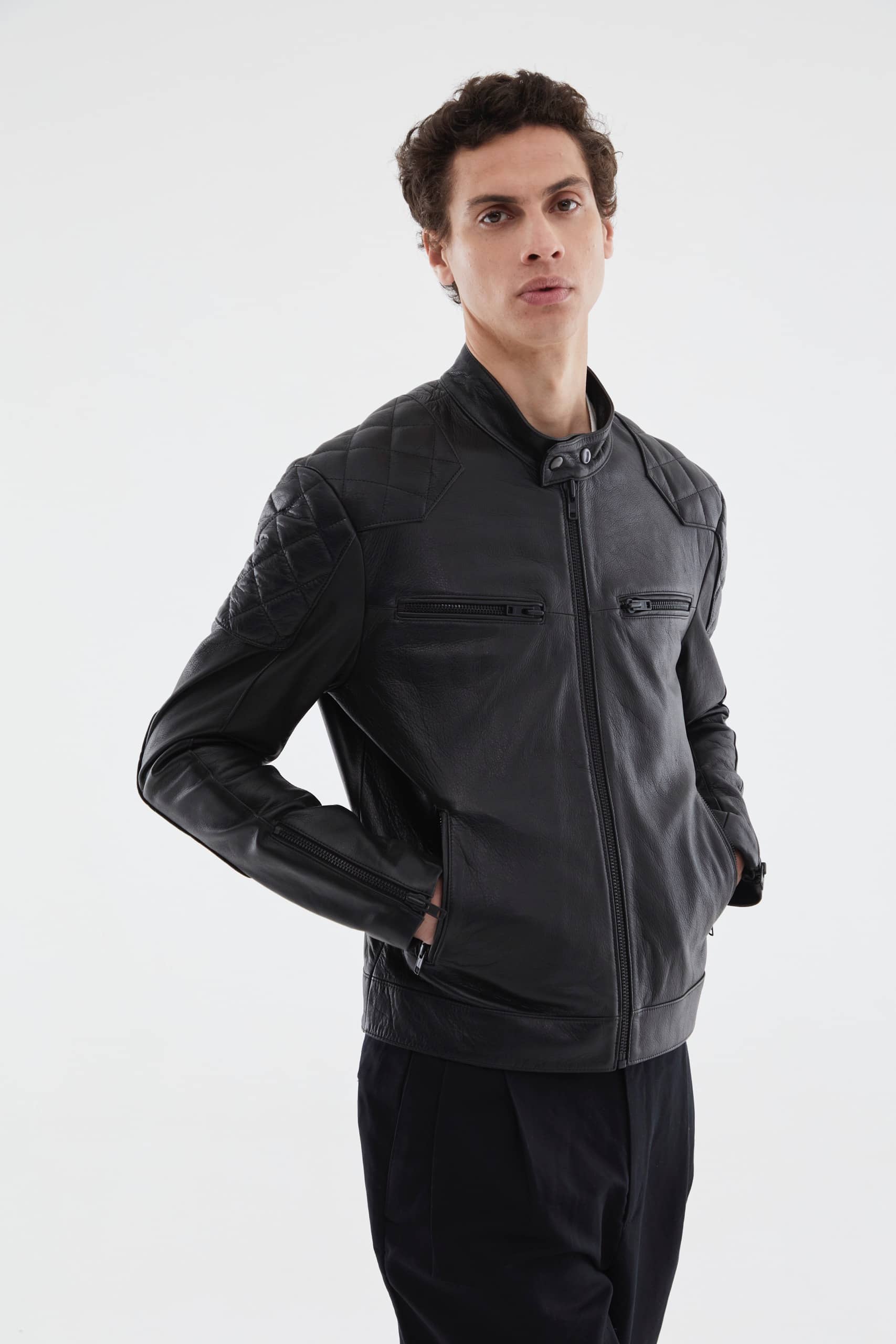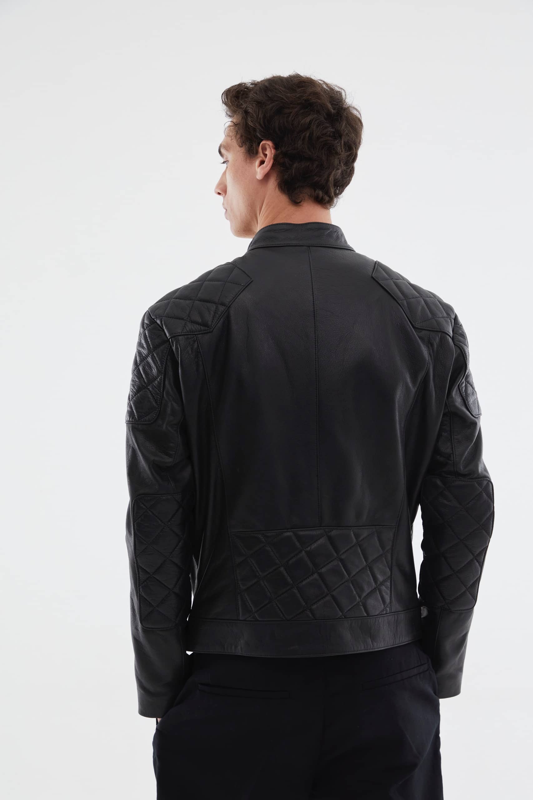 Campera de confección artesanal en cuero vacuno 100% legítimo. Diseño clásico con cierres y botones bronce negro, detalle matelaseado en hombros, mangas y espalda. Interior completamente forrado con microfibra gamuzada. Posee bolsillo interno.