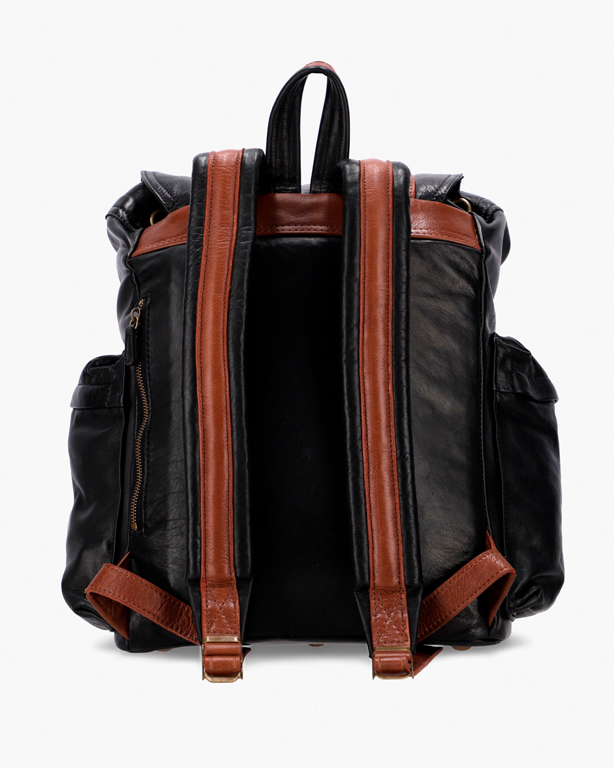 En el frente lleva dos correas en color negro con hebillas de primera calidad color bronce viejo que permiten ajustarse al contenido. Por debajo posee un bolsillo principal grande.