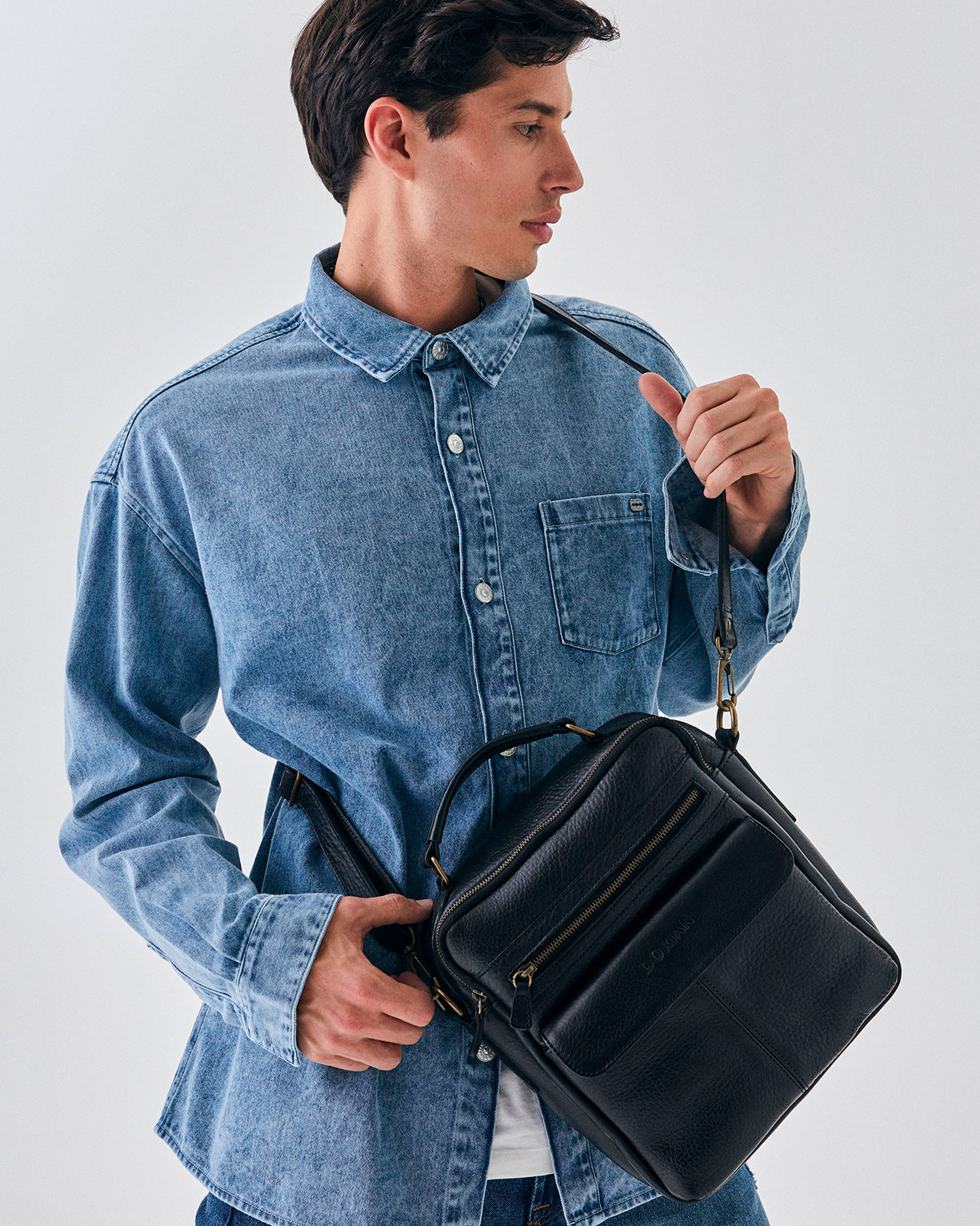 Morral de cuero de confección artesanal en cuero vacuno legitimo. Detalles en bronce viejo, correa ajustable. Doble Bolsillo Frontal con Broche Imantado y Cierre. Doble compartimento con cierre interno y separación con protección para tus dispositivos.