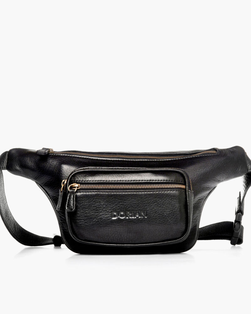 Riñonera de confección artesanal en cuero vacuno. Posee un compartimiento principal amplio, un bolsillo interno con cierre, un porta tarjetas y dos bolsillos externos con cierre. La correa es regulable, gancho con logo DORIAN.